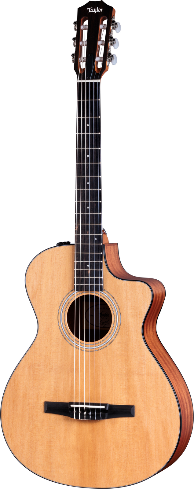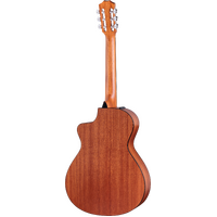 The 112ce-N is our first 100 Series nylon-string cutaway Grand Concert, blending the warm, snappy sound of nylon strings with a comfortable, compact body shape. It offers an outstanding value for players of all skill levels. Featuring a solid, torrefied spruce top paired with layered sapele back and sides, this acoustic-electric offers a clear, balanced voice ideal for fingerstyle players and light strumming. Its 12-fret neck and 1-7/8-inch nut width (narrower than a traditional classical guitar neck) make it easy to play, especially for those transitioning from steel-string guitars. A specialized voicing architecture is designed to enhance the natural warmth and clarity of the nylon strings, providing a well-balanced and responsive tone. Equipped with onboard ES-N electronics, the 112ce-N offers reliable amplified sound for studio settings and stage performances. Its matte-finished body features black binding and a 3-ring rosette. The ebony fretboard is inlaid with 4mm Dots in Italian acrylic and the slotted peghead is outfitted with classical nickel tuners. This model comes in a structured gig bag, offering lightweight protection for players on the move. It’s a great option for players who crave the comfort of a small-bodied guitar, signature Taylor playability and rich nylon flavors at an accessible price point.