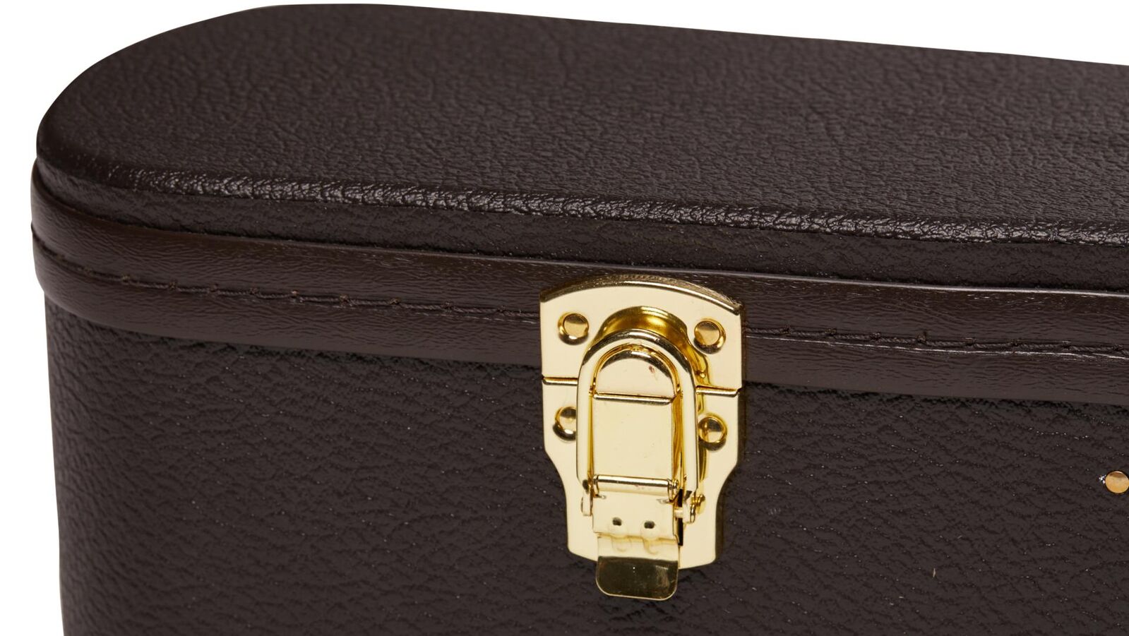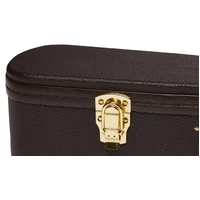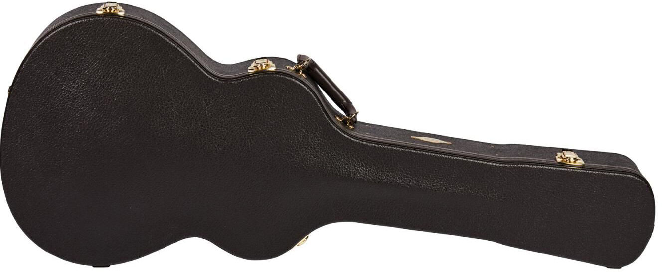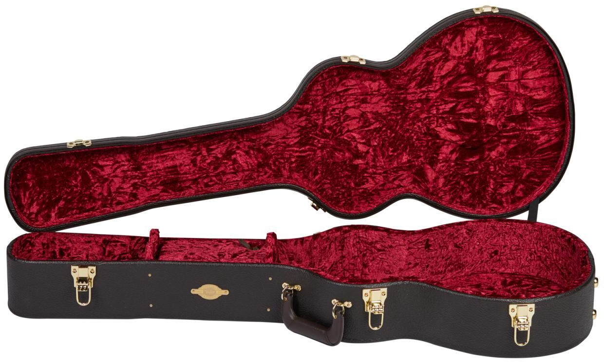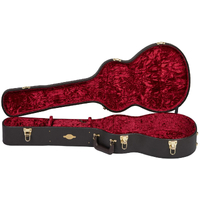 This hardshell Taylor case is adorned with textured dark brown vinyl over a 3-ply wooden structure, with foam padding covered in a plush crushed velvet lining to cradle and protect your guitar. Double neck cradles and shape-specific body shaping provides your guitar with a snug, secure fit. Other features include a padded handle, brass-plated latches, bottom and side feet, and an accessory compartment. Fits standard 14-fret models as well as 12-fret and older NS2 guitars. Use it for Taylor models ending in 2. Model #5200-54