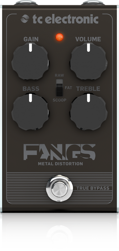 Capable of all the high-gain you and your audience can handle, FANGS METAL DISTORTION sports an easy-to-use control layout including: Gain, to control the amount of drive; Volume, controls the output level; Bass, for setting the amount of bottom-end; Treble, for the perfect amount of highs; and a 3-position midrange selector (Raw/Fat/Scoop) for the ultimate in definition. Nothing is easier!