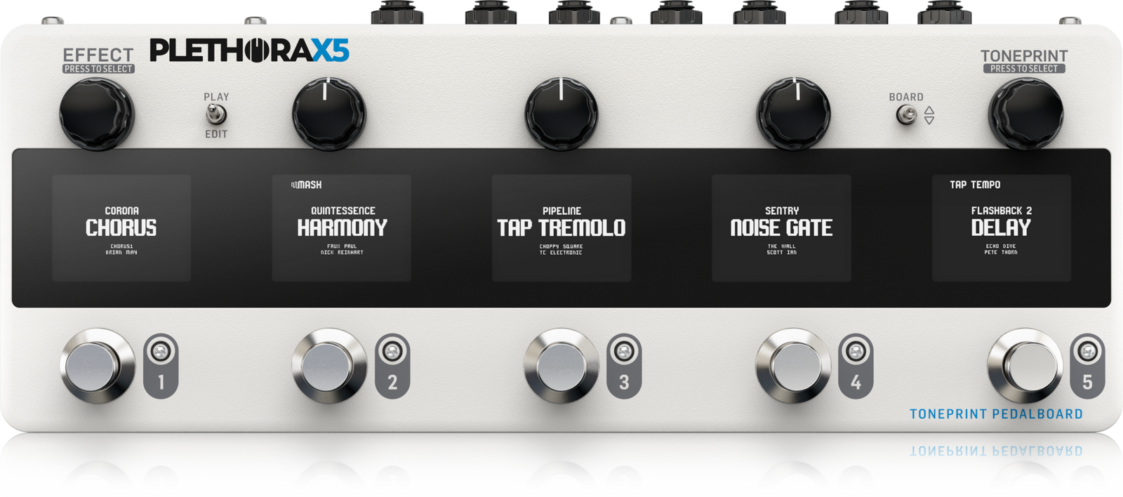 Plethora X5 lets you combine up to 5 TonePrint pedals of your choice and arrange them in any order you need on each of the boards.