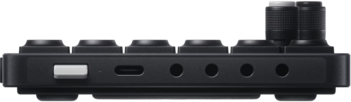 The right side of OP–XY features an advanced i/o system, made to lodge and connect almost anything. Use the main output to connect amps, speakers or headphones. The 4-in-1 multi-out jack can pair pedals, synths, drum machines, even Eurorack systems, and much more. Sample and monitor anything—your voice, dirty stabs, a guitar—with audio-in or the built-in mic. MIDI-in and MIDI over USB type-C offers both host and device modes; use it as a ‘control hub’ for keyboards, drum pads, or cut the cables with Bluetooth LE for low-latency, wireless communication.