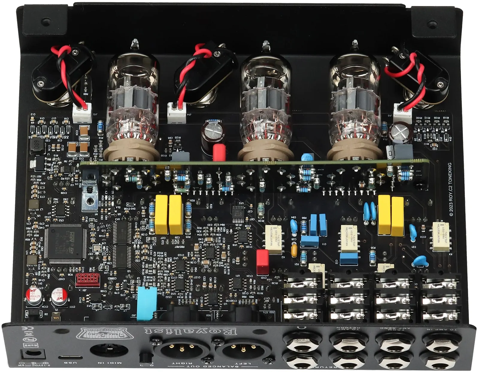 The Royalist Preamp includes Tone King’s “Zero Watt Power Amp,” a genuine phase inverter circuit powered by one of its three 12AX7 tubes. This design captures the Royalist’s harmonic depth and dynamic interaction between preamp and power stage — a key ingredient of true British tone that most preamp pedals can’t replicate. The result is the full experience of an overdriven Royalist power section, without the ear-splitting volume.