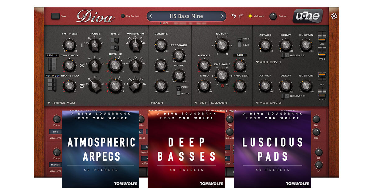 u-he Diva and 150 premium presets across 3 Diva Soundbanks from Tom Wolfe