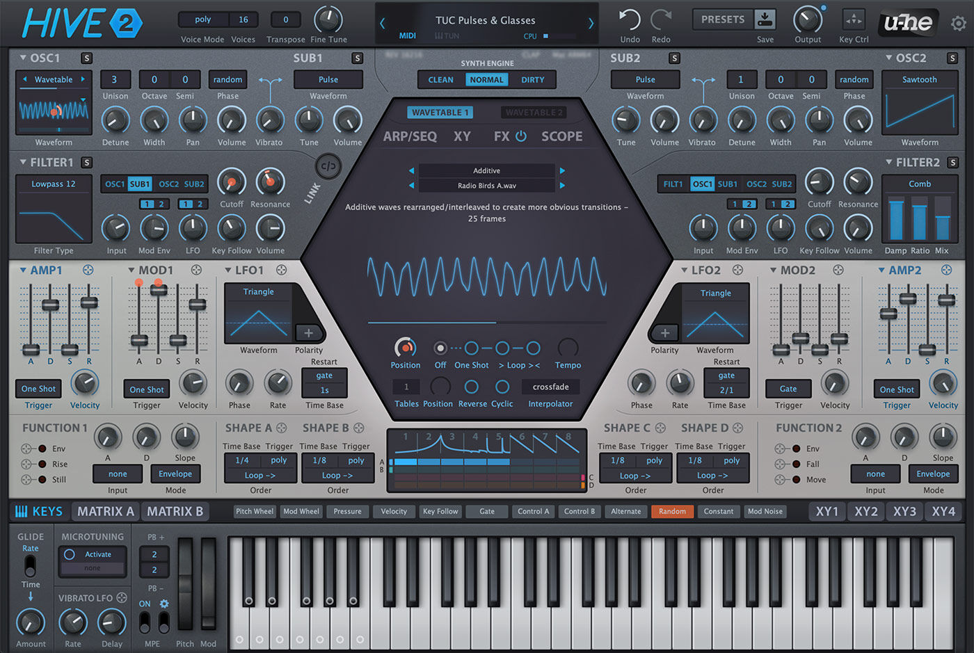 Hive 2 includes Wavetables! These appear as multiple waveforms, and are controlled in the central hexagon. You can manually select wavetables, modulate the wave position via the matrix, or even scan through them automatically using the envelope and loop options (which let you animate wavetables without the need for an extra modulation source).