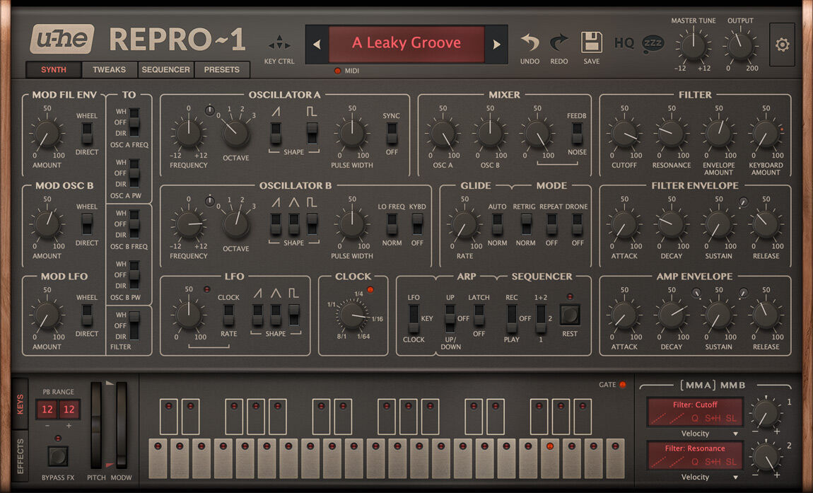 Repro-1 is a fierce monosynth: The classic design gives you immediate access to all the raw power: Two oscillators, self-oscillating 4-pole lowpass filter, arpeggiator, step sequencer, the unique modulation section, and five stomp-box effects which can be arranged in any order. Hard working, raw sounding and immediately playable, it's a simple and intuitive synthesizer which belies a deep feature set capable of a wide range of sounds.
