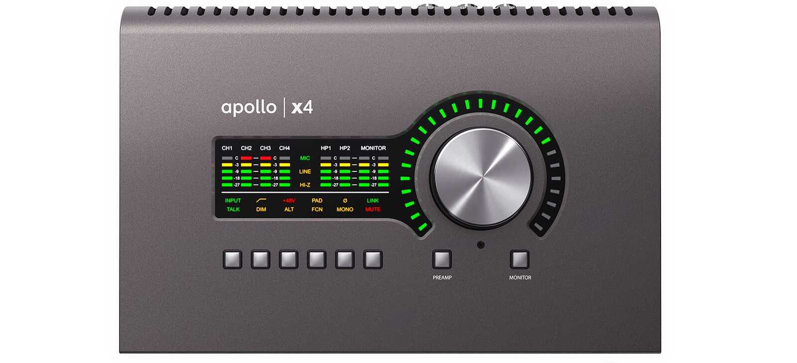 Unison technology is also found on Apollo x4's dual front-panel Hi-Z instrument inputs, providing dead-on impedance and gain matching for guitar and bass amp models from Fender, Marshall, Ampeg, and more.