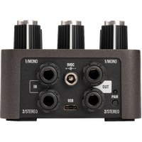 Stereo amp and cabinet emulation pedal with spring reverb and vibrato, multiple speakers, cabinets, and boosts, live and preset modes, and customization with the UAFX mobile app.