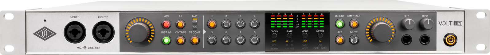 Built by the same team behind the legendary Apollo, Volt 876 USB Recording Studio gives serious music producers a next-generation 32-bit / 192 kHz audio interface with eight onboard Vintage preamps and classic 1176-style compressors right on its front panel, providing big analog studio sound to every mic and instrument you connect.