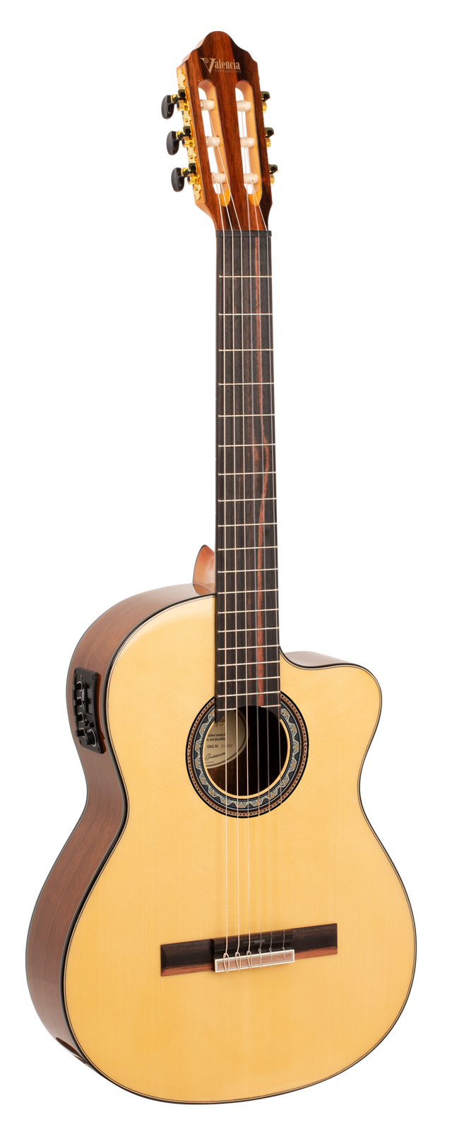 The VC564CE cutaway electric acoustic model is beautifully balanced for effortless playing and you can dial in the Valencia 3-Band EQ preamp to sound great in any situation. The system also has a built-in chromatic tuner.