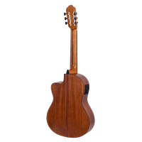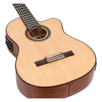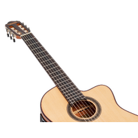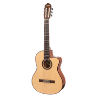 The Solid Sitka Spruce Top, with innovative ToneFlow bracing, gives this guitar an outstanding range that responds to your lightest touch with articulation and detail. Premium Mahogany back and sides enhance low-mid richness. A premium Mahogany neck and Amara Ebony fingerboard deliver exquisite playability. Other features such as exotic wood veneers, inlaid natural wood mosaic rosette and custom decorated machine heads result in a classical guitar that exceeds expectations in looks, tone and feel.