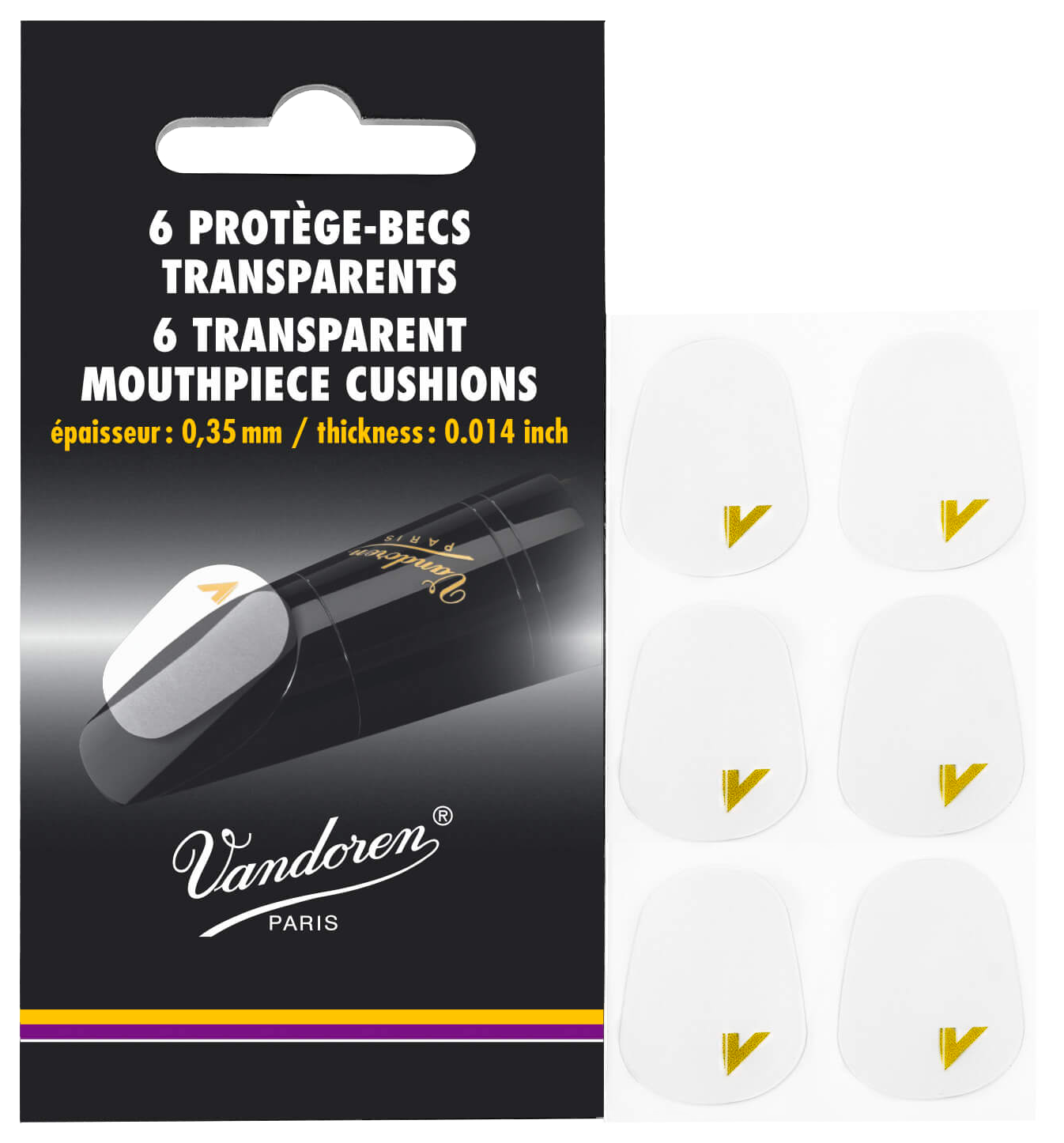 Available in both clear and black, the unique adhesive clinging formula enables the Vandoren mouthpiece patches to be applied and removed multiple times without leaving a sticky residue on the mouthpiece. The mouthpiece cushions protect the mouthpiece from teethmarks. Nontoxic material in accordance with EU Directive 2009/48/EC.