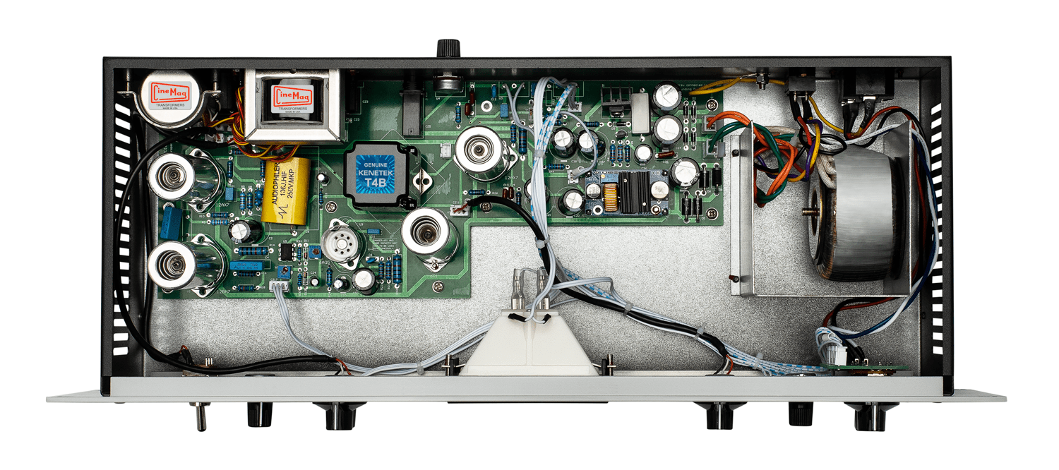 The WA-2A operates on four tubes: two 12AX7’s, one 12BH7, and one 6aq5 (or 6P1J). We proudly use Tung-Sol and Electro-Harmonix brand tubes in the signal path, which sound very 'open' and LARGE. All 4 tubes are socketed for easy swapping and replacement.