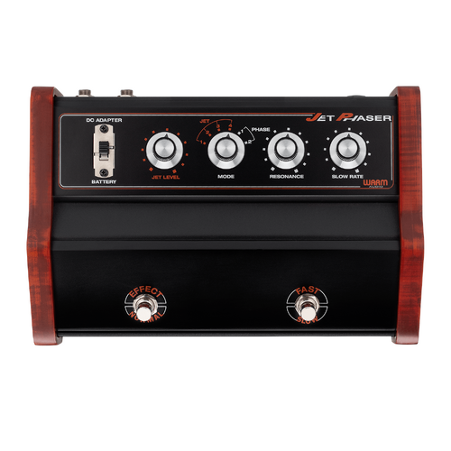 The Jet Phaser also features a RESONANCE control that's available in all six modes, allowing you to dial in varying amounts of filtered sci-fi craziness. Additionally, you get creative control of the modulation rate: the SLOW RATE knob allows you to set the main modulation speed, but hitting the FAST/SLOW foot switch always kicks the rate up to the maximum speed possible. It’s a cool design, because the change from fast to slow ramps up and down gradually like an organ’s rotary speaker. Unlike most phasers, the Jet Phaser can actually get “in-between” speeds by continuously hitting the FAST/SLOW foot switch like organ players do!