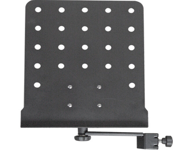 Music desk for attaching to the upright of a microphone stand. Complete with extension arm with three options for desk positioning. Mounting bracket. Fully adjustable music desk 31.5cm (H) x 25cm (W).