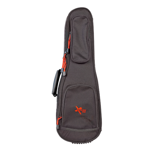 Soprano ukulele bag. Black heavy duty nylon waterproof yarn. Reinforced interior lining with 10mm foam protective padding. Full length heavy