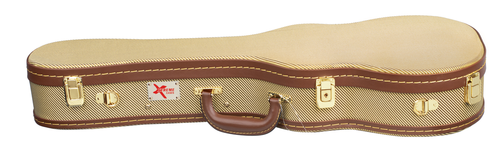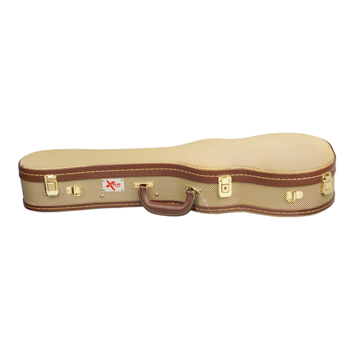 EXTREME - Concert Ukulele Case. Plywood covered in a tough vintage style yellow tweed cloth. Thick foam interior padding. Black plush lined. Centre accessory compartment with lid. 3 deluxe gold latches with lock . Tan trimmed edging with gold reinforced stitching and matching imitation tan leather handle.
