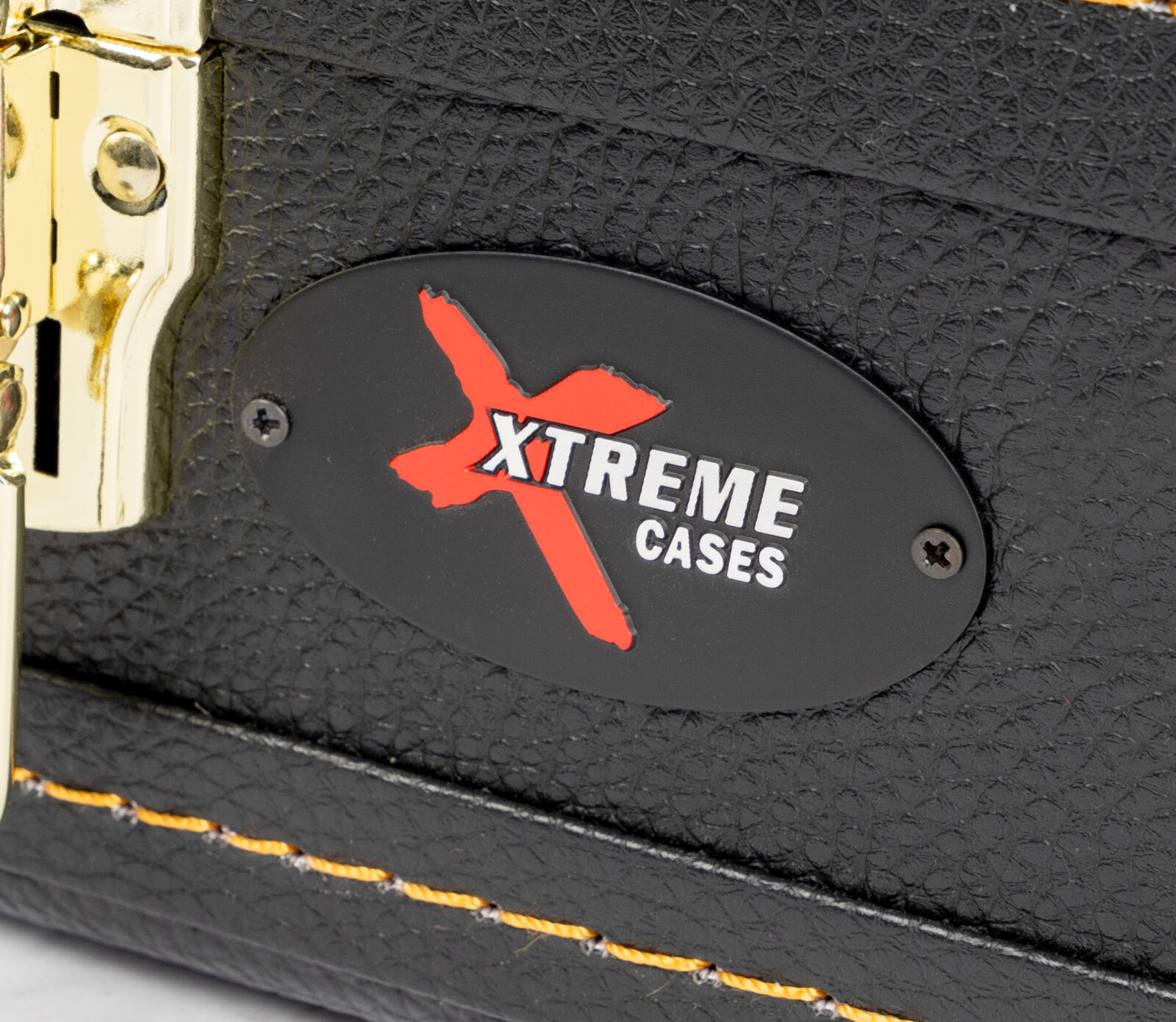 Heavy duty plywood covered in black vinyl with orange stitching.
