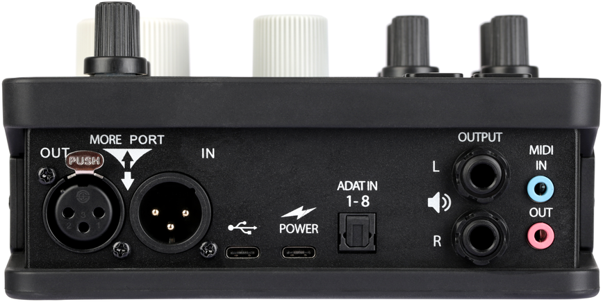• The More You Hub is the heart of the system, with two combo inputs for microphones and instruments, and outs to your DAW, headphones/IEMs, and studio monitors