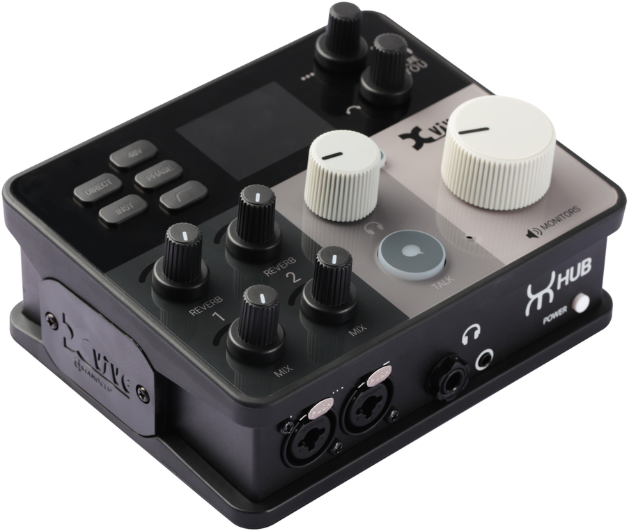Each musician/singer with either a MORE YOU Hub or a MORE YOU 2X has two inputs—for example, a vocal microphone and a guitar. The Hub or 2X is mounted on a mic stand right in front of you. Plug in your mic and guitar, plug in headphones/earbuds/in-ears (with either ¼” or ⅛” plugs), and control the volume of each input at any time—adding reverb on either or both inputs, if and as desired!