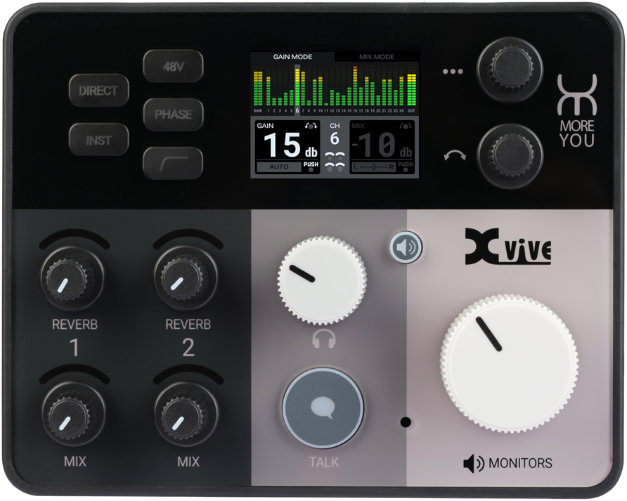 MORE YOU features True Gain, pristine-sounding analog mic preamps that are digitally controlled, with 1dB steps for precise gain recall and a colorful LCD screen that gives users a visual of their input signal and gain. Since musicians and singers are connecting their microphone or instrument into a Hub or 2X that is literally right in front of them, they can use shorter cables, resulting in maximum headroom and signal integrity.
