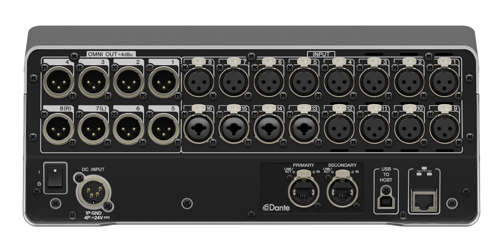 Local I/O: 16 Mic/Line (12 XLR + 4 XLR/TRS Phones Combo) inputs, and 8 (XLR) outputs