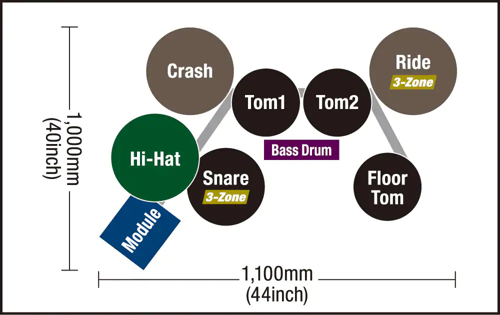3-zone pads for the snare, crash, and ride. The cymbals can be choked and muted. Ride cymbal equipped with a hit point detection function