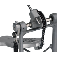 The FP7210A is a chain drive pedal that folds for portability. It features adjustments for beater angle and spring tension. The traditional felt beater is perfectly weighted and the side-adjustable hoop clamp holds firmly to hoops of various sizes.