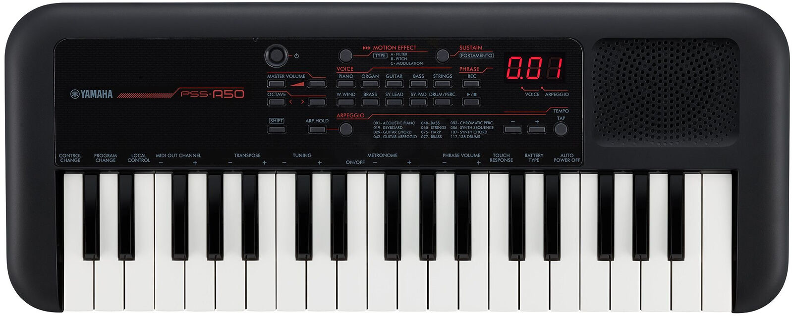 The built-in Arpeggiator inspires new ideas, creates melodies and beats, and to help you make magic, use the Phrase Recorder to loop, playback and record. Connect to a home recording setup and discover even more ways that the PSS-A50 will become your trusted musical companion.