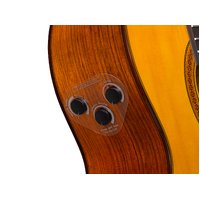 The battery box is integrated into the end-pin jack, requiring fewer holes in the body and thus reducing acoustic sound loss. Connect a cable from the jack to a PA or amp to use the TA instrument as an acoustic-electric guitar.