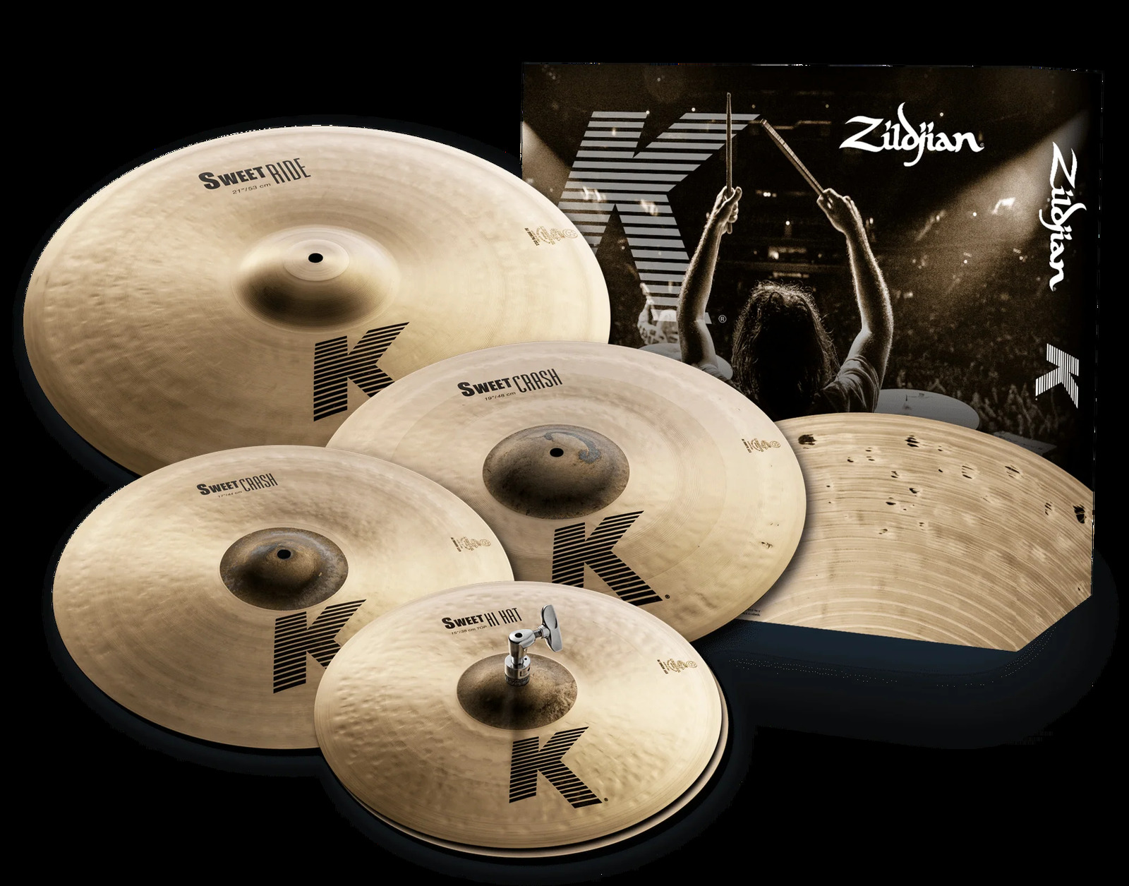 In response to customer demand, the new K Sweet Cymbal Pack offers a full setup of cymbals from the popular K Sweet line. This pack includes larger, darker crashes, and pushes the iconic Zildjian K sound in a new, alternative direction. Cymbal Pack Includes: - 15" HiHats - 17" Crash - 19" Crash - 21" Ride